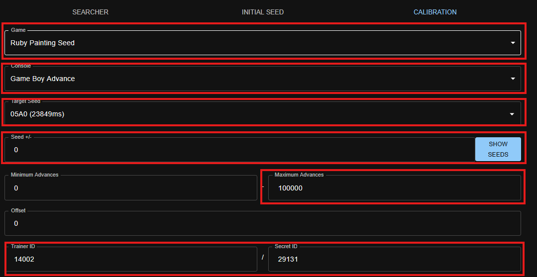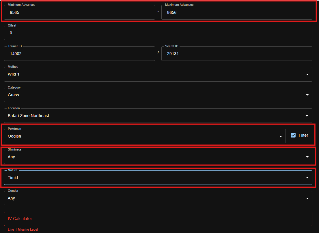 We'll leave Game, Console, Seed, Seed+/-, Offset, and Method alone, but we are going to change Minimum Advances. To be about 1000 advances before our target.