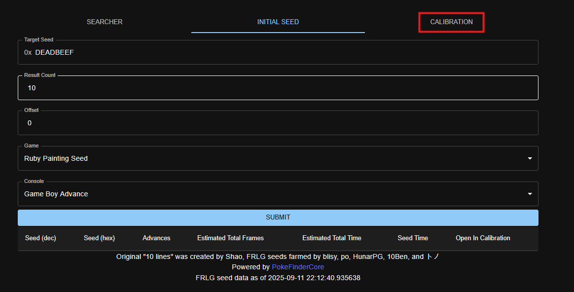 The first thing we have to do is pick our target Pokémon. Open the Ten Lines website, and select the Calibration tab.