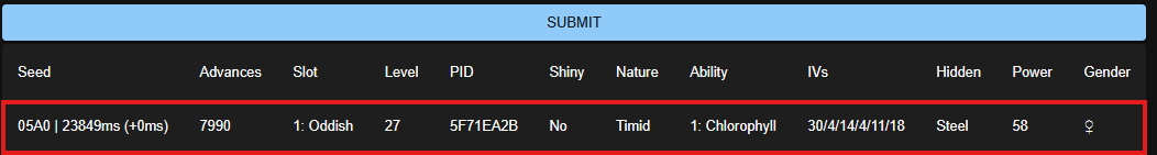 At this point, hit Submit. You should only get one result. If you get more than that, you can narrow down the results further by doing more levels in the IV Calculator.