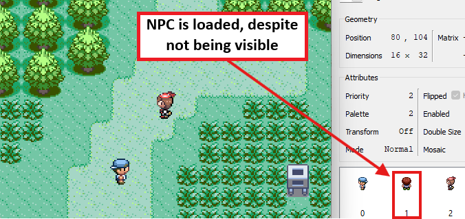 Emulator) showing that the NPCs sprite is still loaded, but he's not